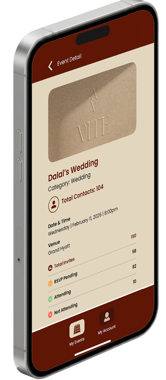 VITE is an event invitation management app designed to make hosting simple and organized. Share your event details and guest list with the VITE team, and we’ll manage your digital invitations, guest responses, and attendance—so everything runs smoothly for your occasion.