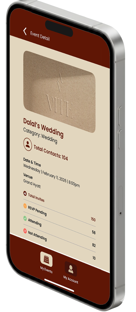 VITE هو تطبيق لإدارة دعوات المناسبات، مصمم لجعل الاستضافة سهلة ومنظمة. شارك تفاصيل مناسبتك وقائمة الضيوف مع فريق VITE، وسنتولى إدارة الدعوات الإلكترونية ، و متابعة حالة حضور الضيوف، وتنظيم الحضور لتسير مناسبتك بسلاسة من البداية للنهاية.